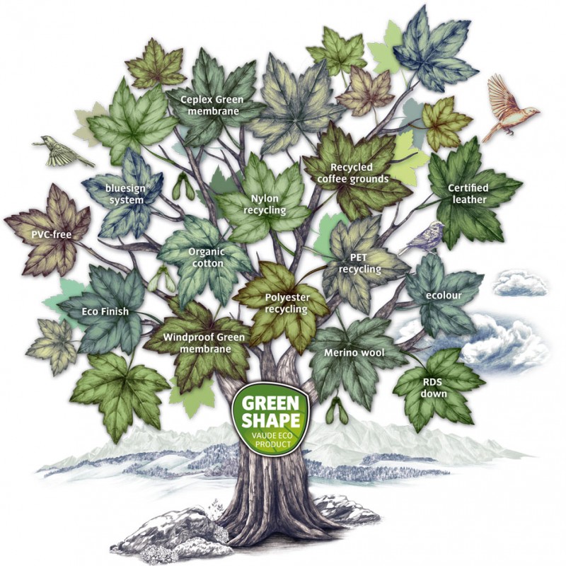 Европейският лидер сред гореспоменатите фирми в областта на аутдор оборудването определено е Vaude. На световно ниво този въображаем трон все още се оглавява от Patagonia, но не може да се пренебрегне, че и Vaude има много добър старт. Като се има предвид, че в сравнение с Patagonia, това е сравнително малка семейна фирма, техните усилия са още по-похвални. Съвет: Можете да си припомните отличния подход на марката Patagonia в нашата по-стара статия. Тъй като представителите на фирма Vaude напълно осъзнават своя дял от отговорността за нашето общо бъдеще, концепцията Green Shape е тяхна отличителна черта от няколко години. Какво означава това на практика? Минимум 90% от използваните материали могат да бъдат определени като екологични и щадящи околната среда. Акцентът е поставен както върху източника на този материал, така и върху неговата обработка и последващата възможност за рециклиране или разграждане. С това тясно е свързано и сътрудничеството със системата BlueSign, която контролира и гарантира екологично чистия начин на производство.